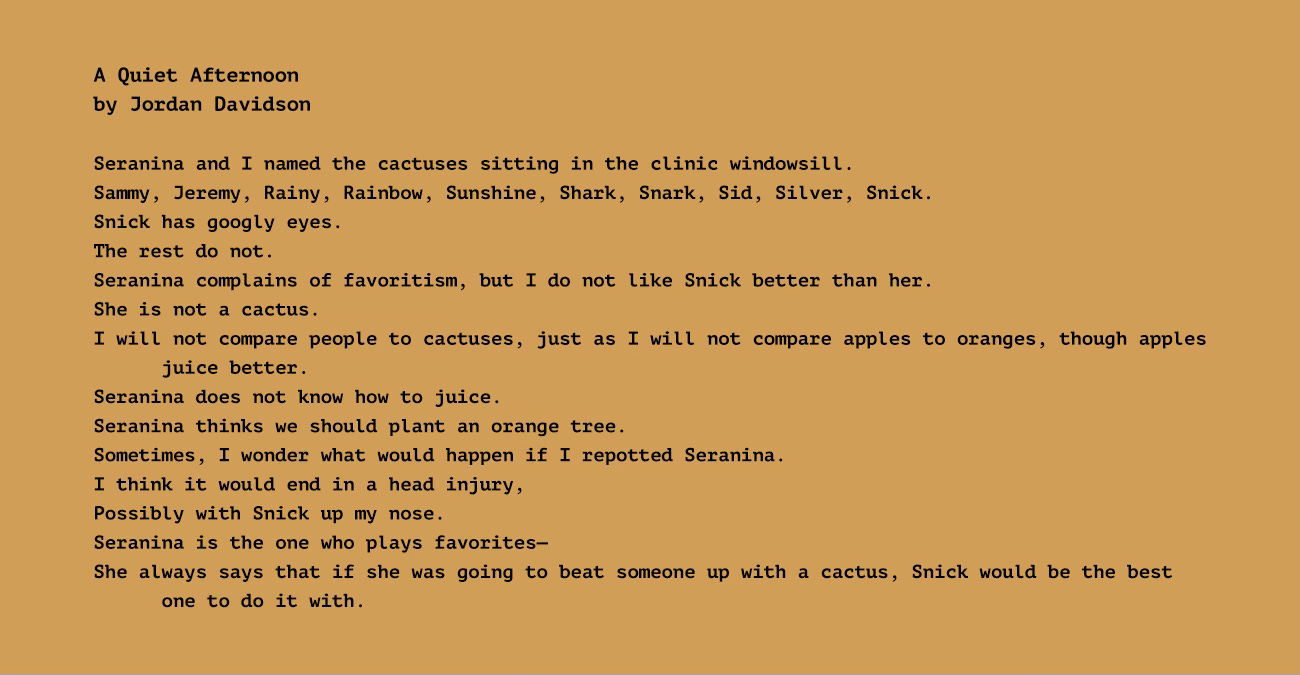Jordan is a student at Yale University majoring in Applied Physics and Witchcraft. The mixture is confusing to her, as well. Her work has previously been published in Outlander Zine, Body Without Organs, and Aster Lit, among others.