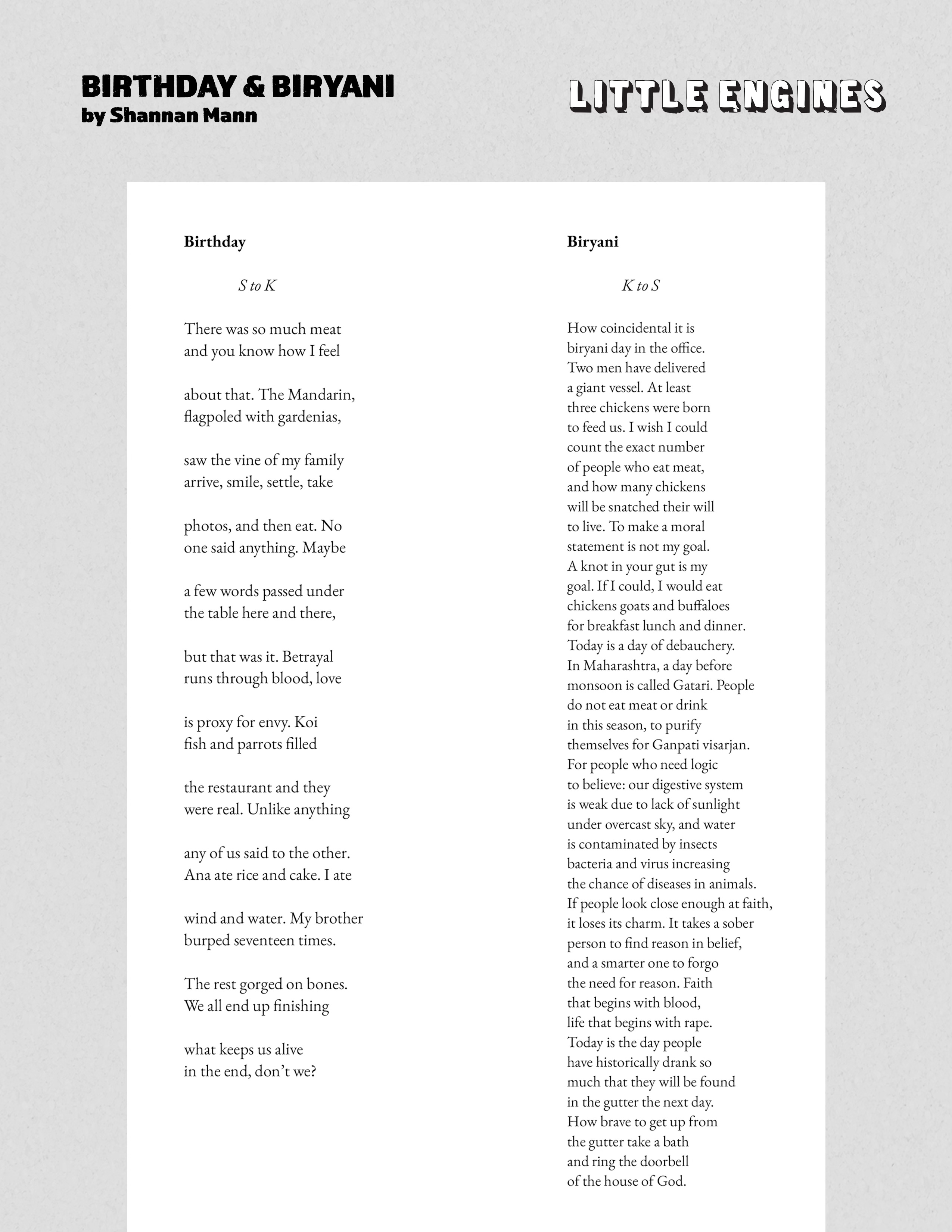 I’m dispassionate about eating food, but more and more into food in fiction and poetry. The speakers in Shannan Mann’s pair of new poems are eating through annual celebrations. Shannan’s stuff is bold and cool. It’s tough, as in muscled: