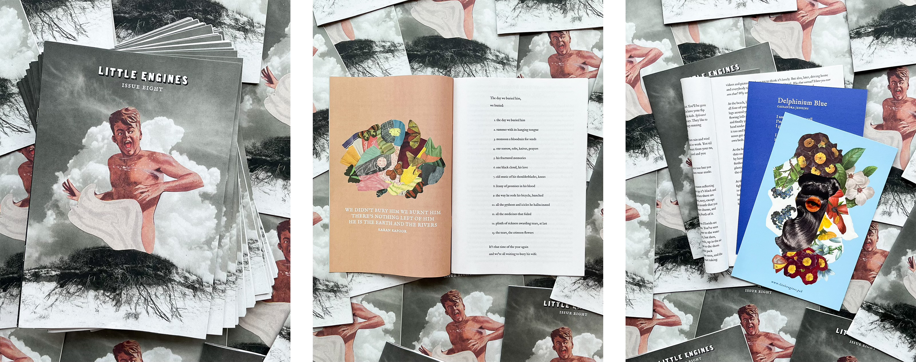 Each writer’s work is accompanied by an original collage by this issue’s artist in residence, KEVIN SAMPSELL. Kevin is an accomplished writer, an adventurous publisher, a crucial bookseller, and his collage work shows up often in quality pubs, attached to much cool writing. Kevin showed Little Engines love during version 1.0, long ago. I remember packing up copies to send to Powell’s, thinking about the great shit they’d be sitting next to on the shelves there.