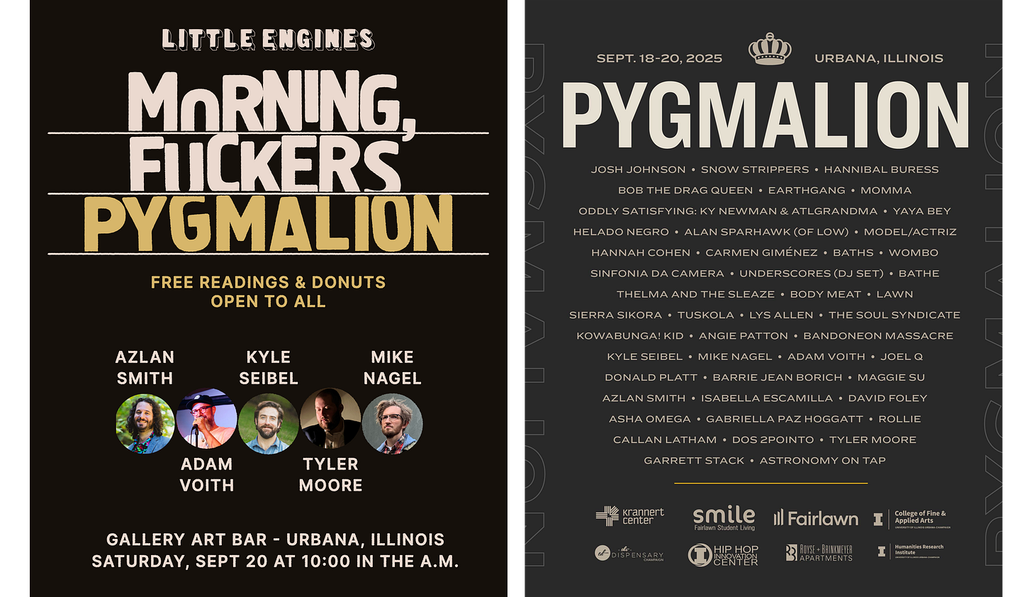 The early-riser reading series heads to Pygmalion festival in Urbana, Illinois, on Saturday Sept 20 at 10:00am, along with a soon-to-be-announced show in Chicago at Exile in Bookville on Sunday morning, Sept 21.