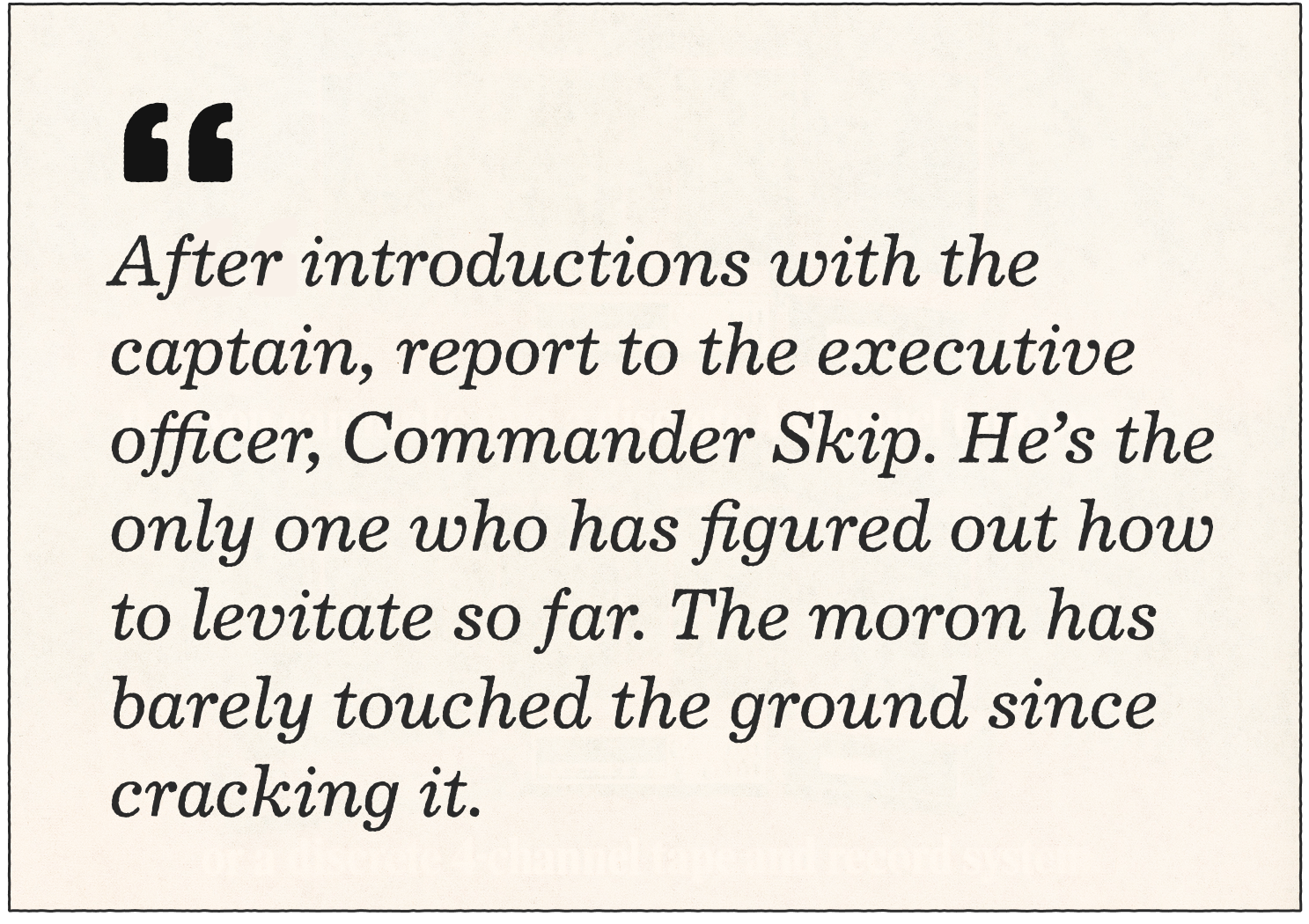 After introductions with the captain, report to the executive officer, Commander Skip. He’s the only one who has figured out how to levitate so far. The moron has barely touched the ground since cracking it. Before reporting to The Office of Future Plans, Commander Skip was a helicopter pilot. The thinking goes this made for relevant experience.