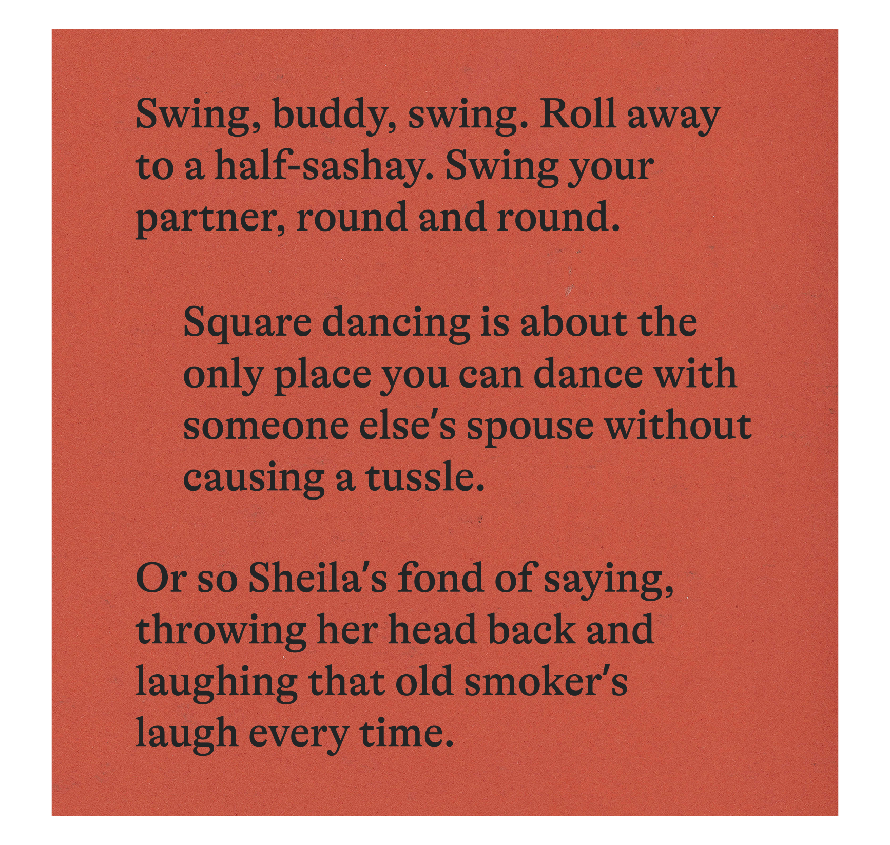 They say you dance with the one that brought ya. Square dancing, though, that’s not always the case. You can dance with anyone, long as you know where you stand. Like as not, though, you end up more or less where you started. I like that. The world outside these walls, it’s not like that. I’ve come to accept it. But it’s nice to be in a place that makes sense. And I gotta tell ya, I’m in the best shape I’ve been in since the kids were born. Just from following Gerard’s calls, and putting one foot in front of the other. One foot in front of the other, over and over and over again.